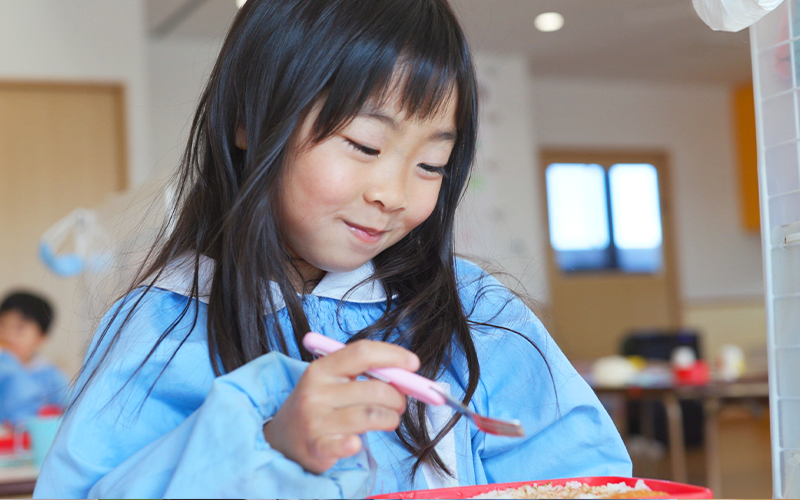 午前のあそび、活動が終わると給食の時間です。給食は栄養バランスをしっかりと考えたものを出しています。